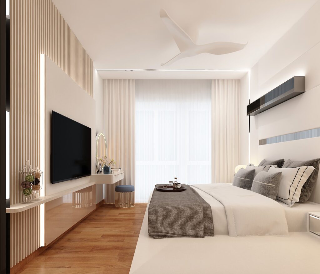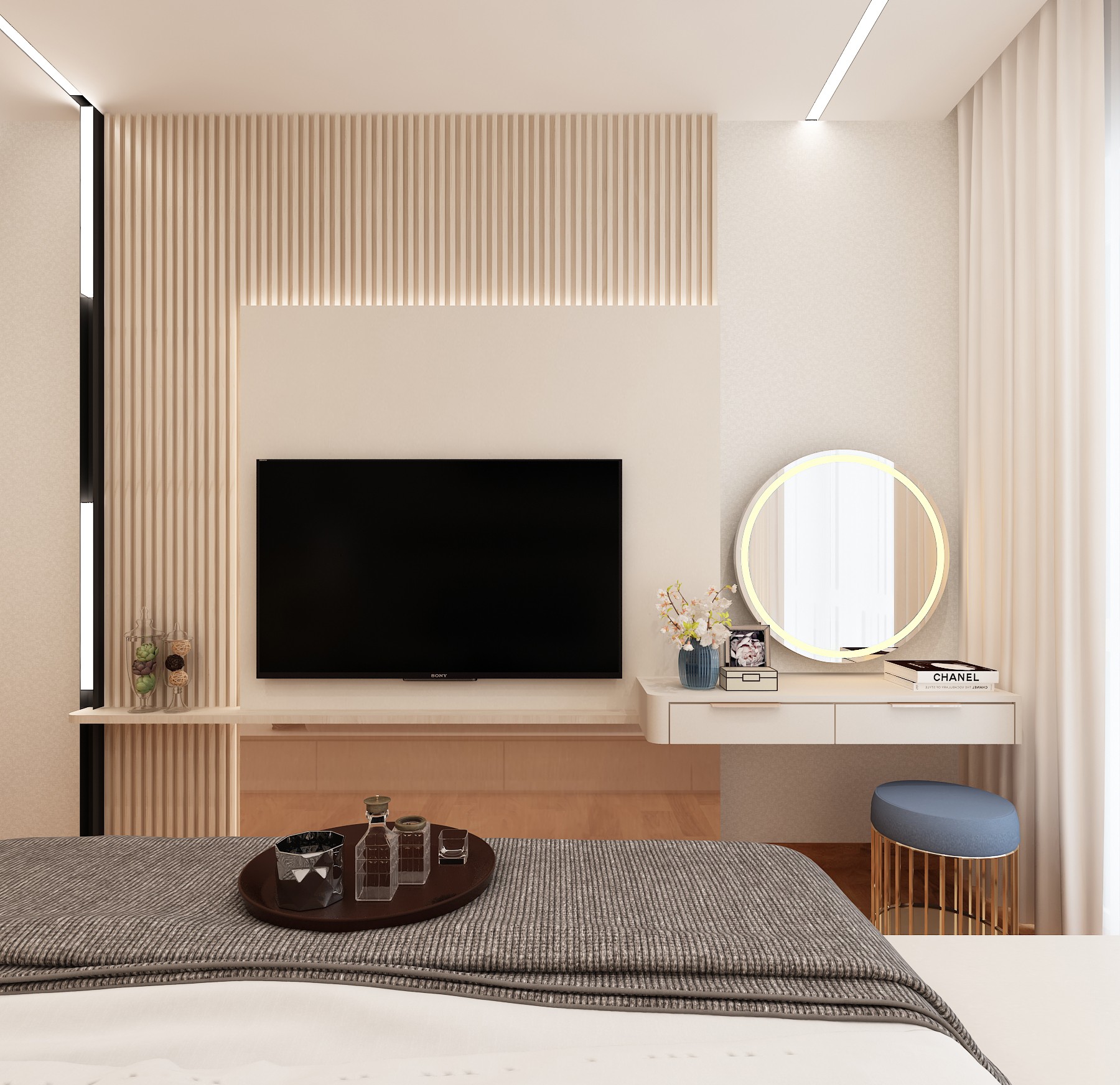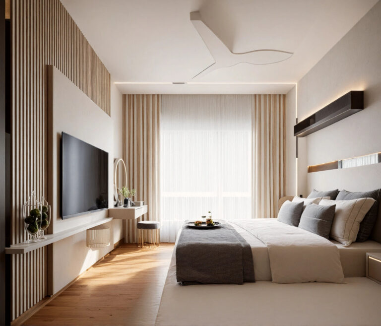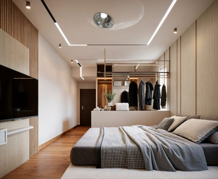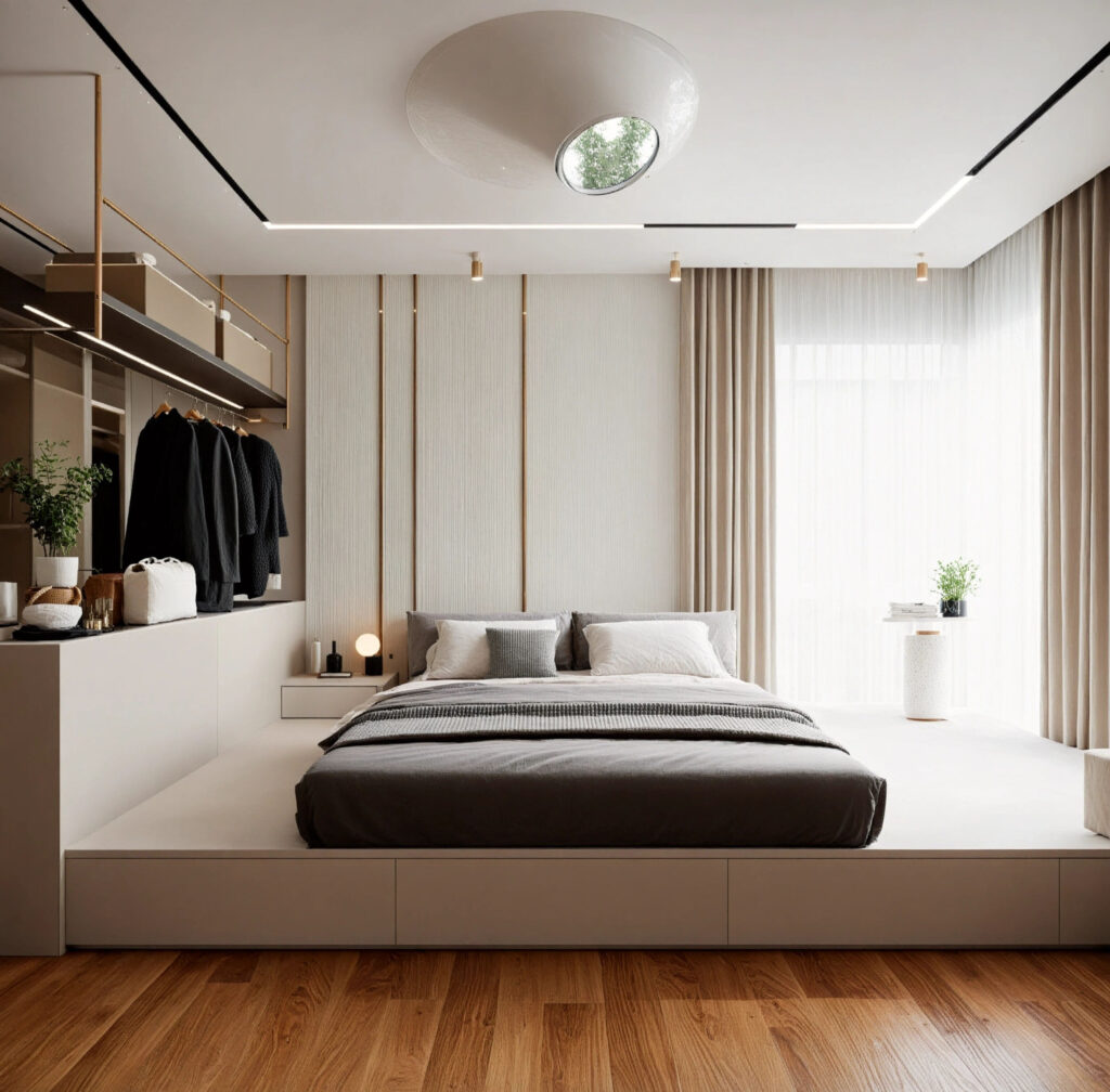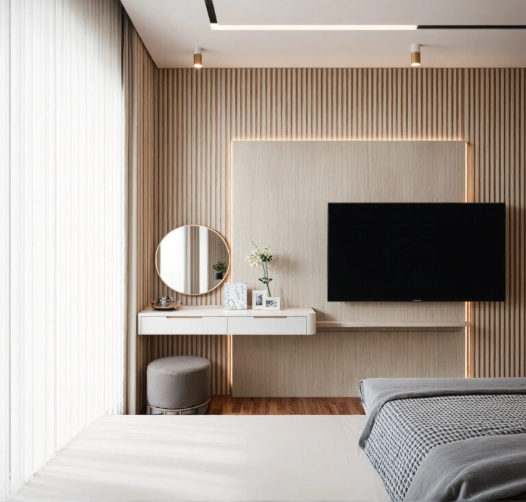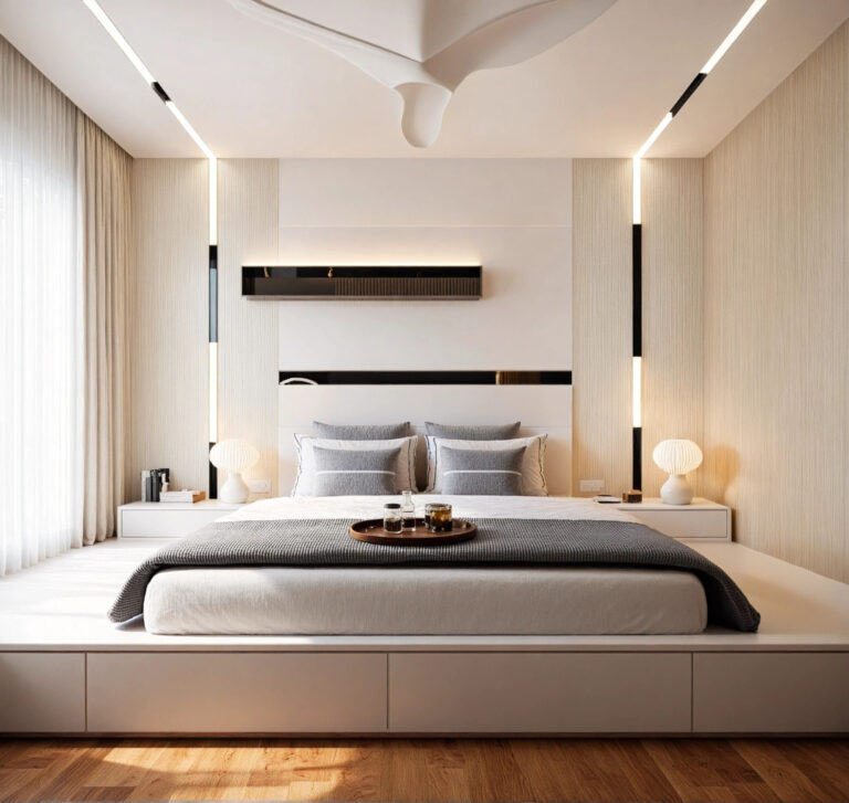 The space was designed with an inward focus, using controlled openings and soft material transitions. Storage and functional elements were integrated to maintain visual calm. With a highly layered lighting scheme, incorporating recessed perimeter channels, delicate pendant accents, and a distinctive overhead feature light works to enhance the geometry and create a spacious yet profoundly cozy ambiance.
